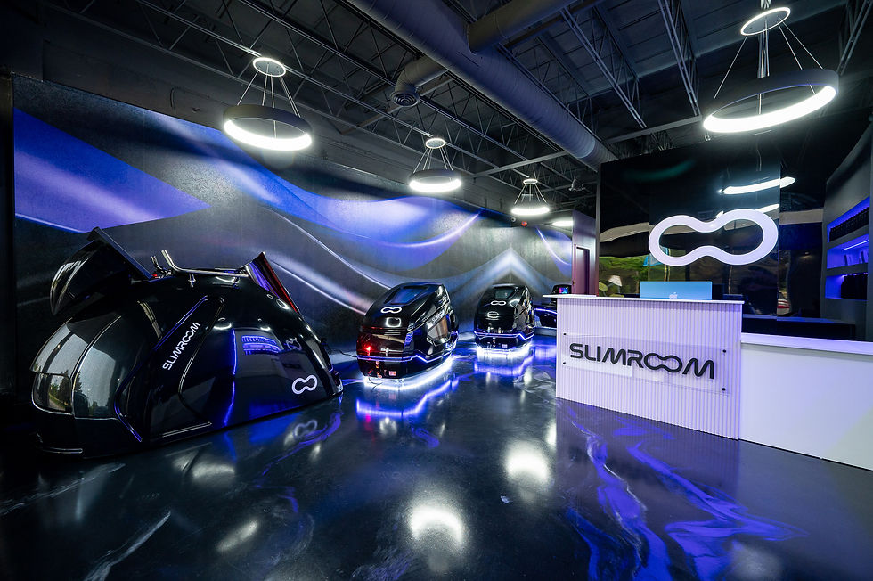 This interior immerses visitors in a high-tech, futuristic environment that feels straight out of a sci-fi narrative. Glossy black pod-like machines sit illuminated by vibrant LED underglow, casting ethereal reflections on the polished marble-effect floors. The ambient lighting—anchored by circular, halo-style fixtures—complements the fluid, wave-inspired wall mural, giving the space a sense of movement and energy. The overall palette of deep blues, purples, and crisp whites maintains a sleek and premium aesthetic. Every design detail—from the infinity-inspired logo to the minimal yet impactful reception desk—conveys innovation, luxury, and a forward-thinking experience.